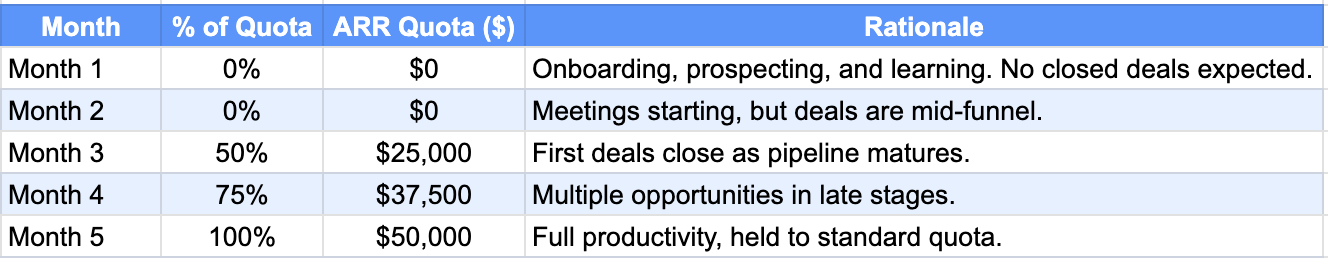 You can’t assign full quota from day one. A new AE needs time to ramp up, learn your product, understand the ICP (ideal customer profile), and become effective at selling. On top of that, pipeline takes time to build, opportunities take time to mature, and the first bookings usually don’t show up until well after the average sales cycle has run its course.