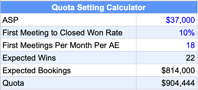 Note that the expected bookings is 90% of quota, which is a common way to give the AEs a little bit of a stretch goal - to make sure that those above average are the ones hitting their quota.