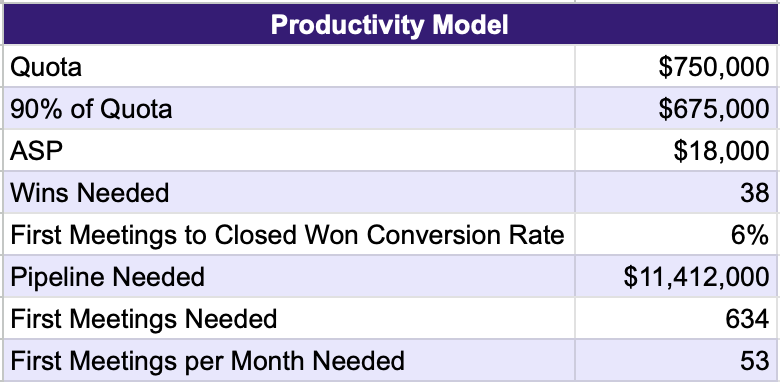 While I expected a mismatch, I was shocked how unattainable Stan’s quota was. He was getting just under 20 first meetings a month. But the quick model I had built out showed that he needed 53 meetings per month. That was almost three per work day. And this is a sale that often took several meetings and a small POC to get a win. There just weren’t enough hours in the day or enough meetings to justify his quota.